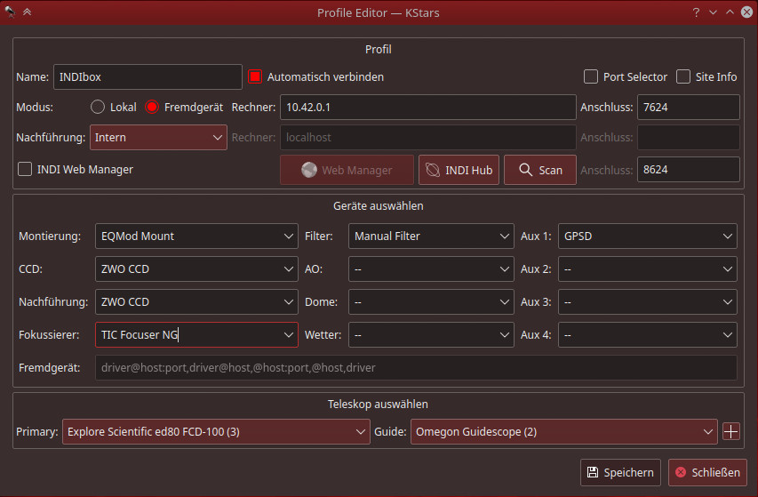 Ist alles ausgewählt, muss das Profil noch gespeichert werden und anschließend kann man es testen. Starte EKOS und es öffnet sich das INDI Control Panel