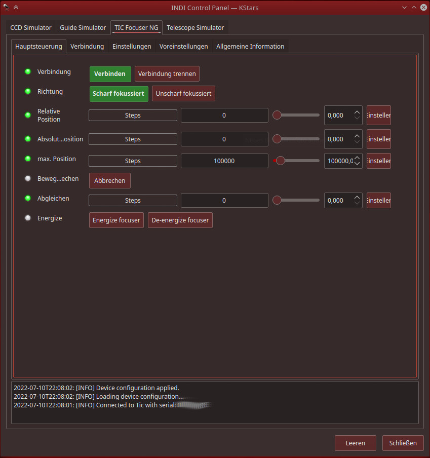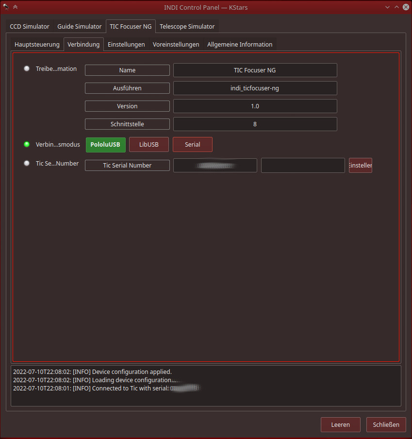 Sollte alles korrekt installiert sein, sollte es so ähnlich wie auf den Screenshots aussehen. Hier im Tab Tic Focuser NG gibt es weitere Tabs. Wichtig ist, im Tab Verbindung der Verbindungsmodus. Er sollte auf PololuUSB stehen. Der ist verfügbar wenn die Tic Software korrekt installiert wurde.