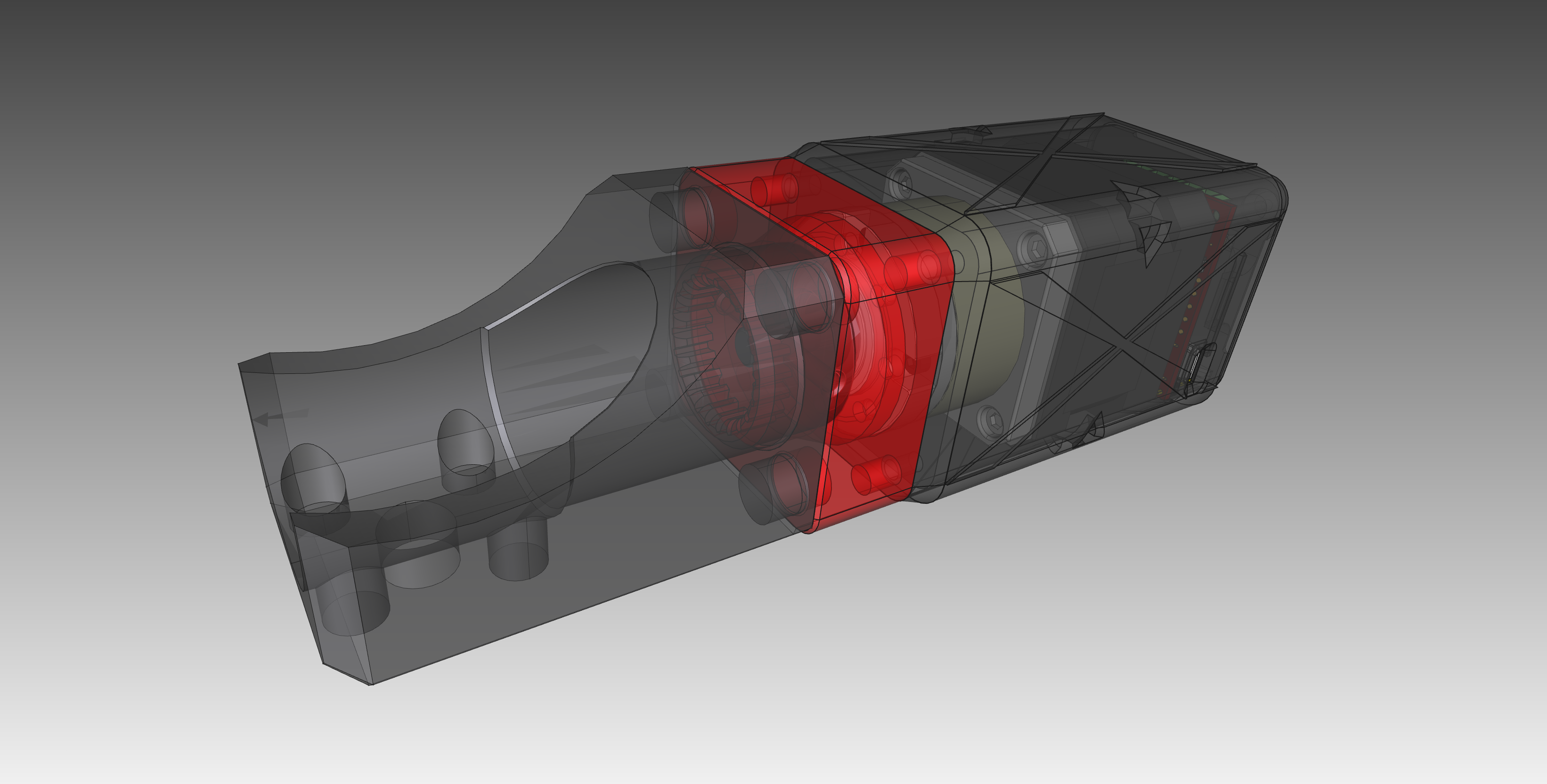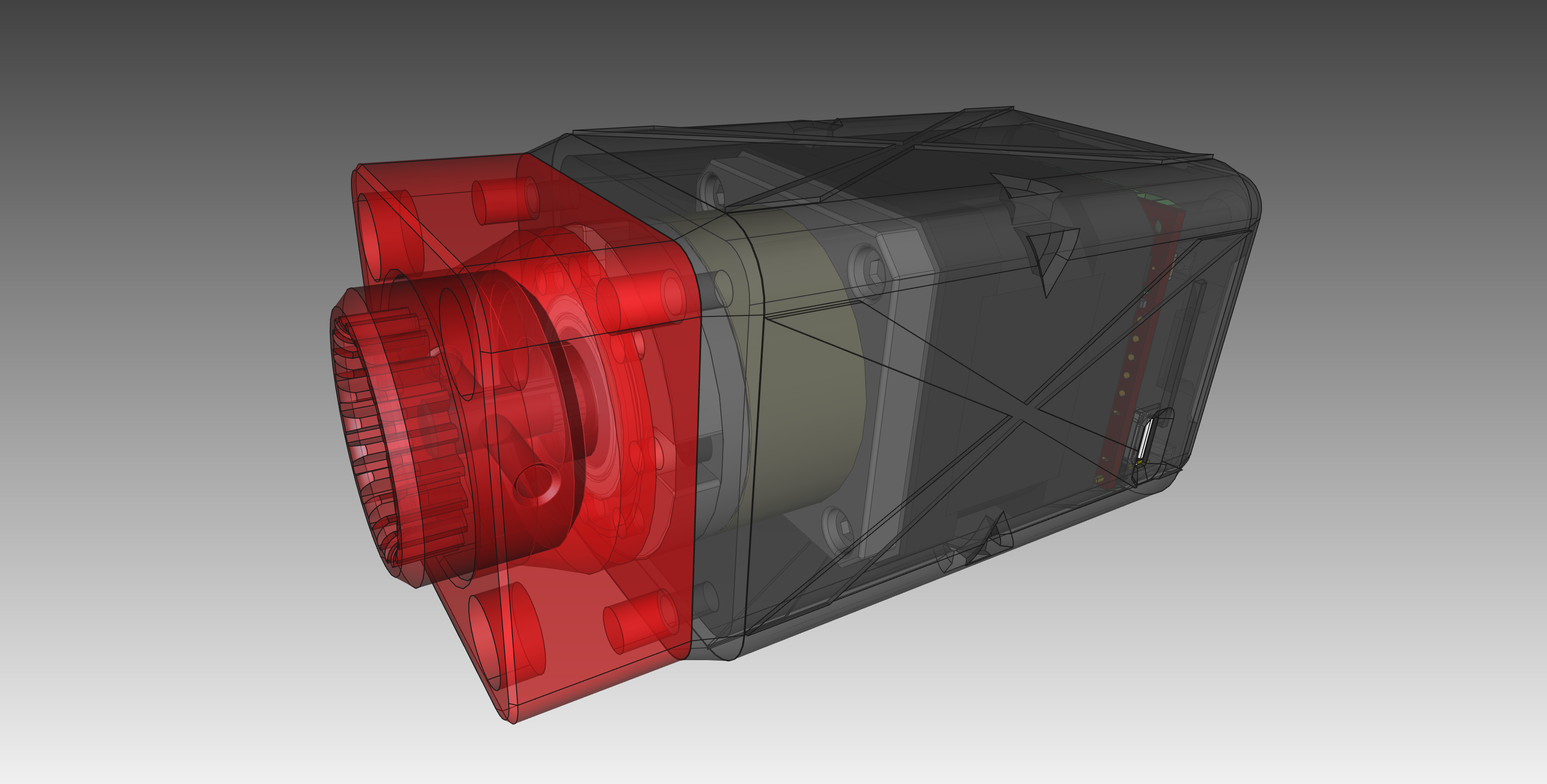 Hier siehst Du eine 50%ig transparente Ansicht vom [MTF] Fokusmotor, rechts mit einem Flansch, der zum Hexafoc des Explore Scientific ED80 FCD100 passt. Der Flansch und die rote Platte am Focuser haben jeweils 4 starke Neodym (N45) Magnete. Die am Teleskopflansch sitzen 1mm tiefer im Flansch, die am Focuser stehen 1mm heraus. Das ergibt eine Verdrehsicherung, Zentrierung und einen wirklich festen Halt.