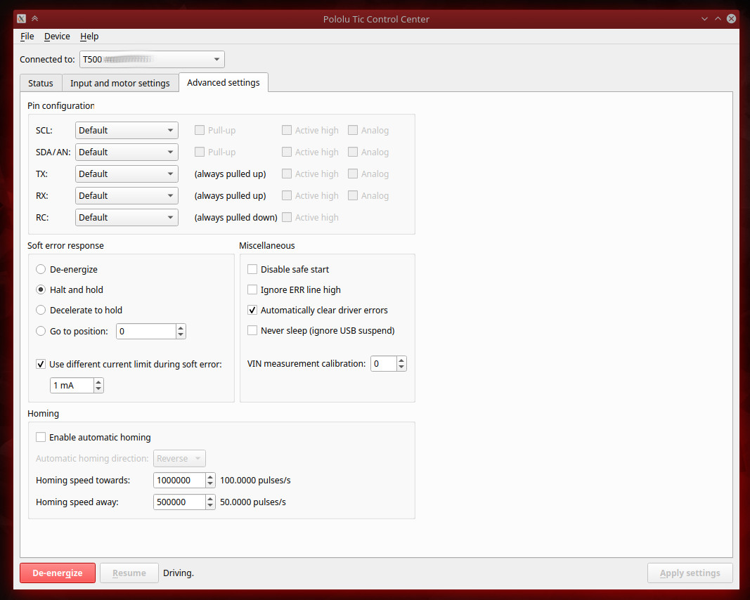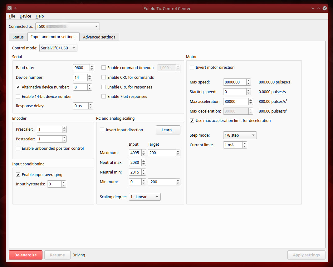 In der Pololu Software (ticgui) solltest du die folgenden Einstellungen vornehmen: