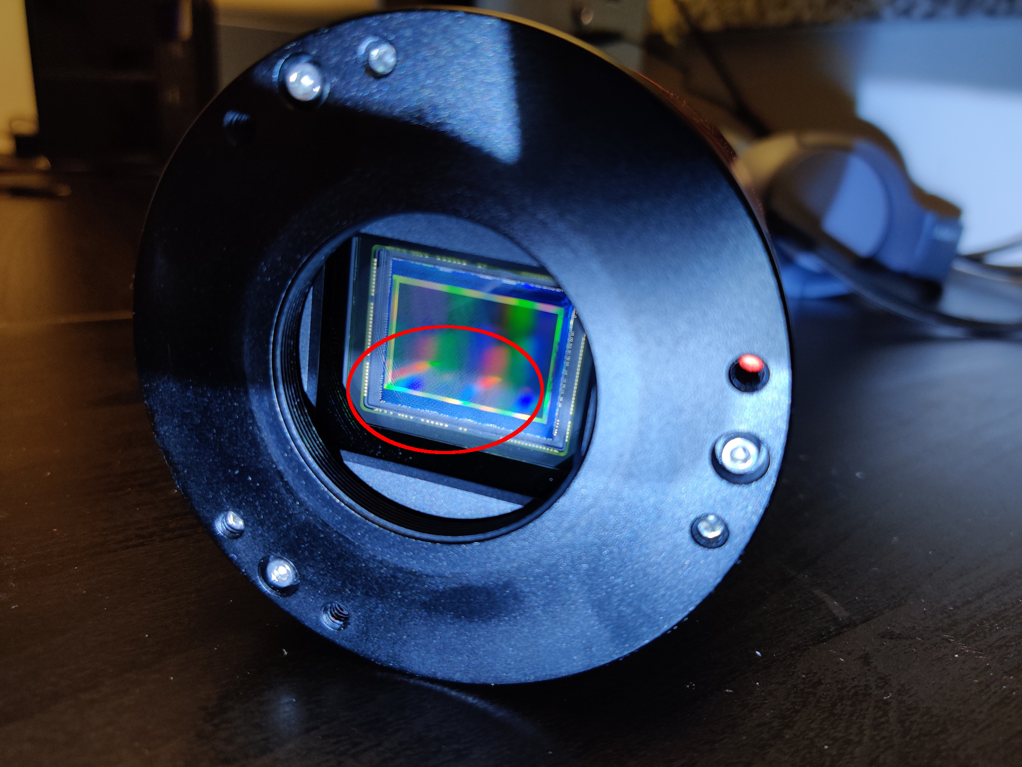 Asi071 MC Pro - vereister SchmutzMit einer Taschenlampe konnte ich das ganze auf einem Foto festhalten. Es sieht irgend wie aus, als hätte da jemand in der Fabrik ein schmutziges Tuch auf dem Sensor benutzt, die Größe und das Muster erinnern zumindest an die Struktur eines Tuchs. Die Kamera wurde wieder geöffnet, und tada! Der Sensor ist tatsächlich verschmutzt! Scheinbar friert da dran die Luftfeuchtigkeit fest. Der Sensor und das Deckglas wurden mit Propan-2-ol gründlich gereinigt und anschließend mit einem Sensortupfer von den letzten Staubkörnchen befreit. Jetzt (!) ist die Kamera wie neu.
