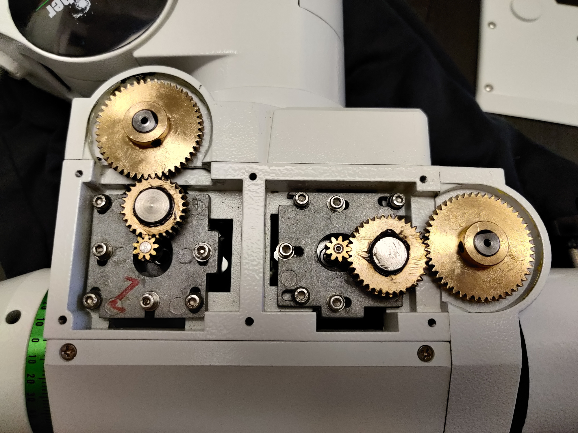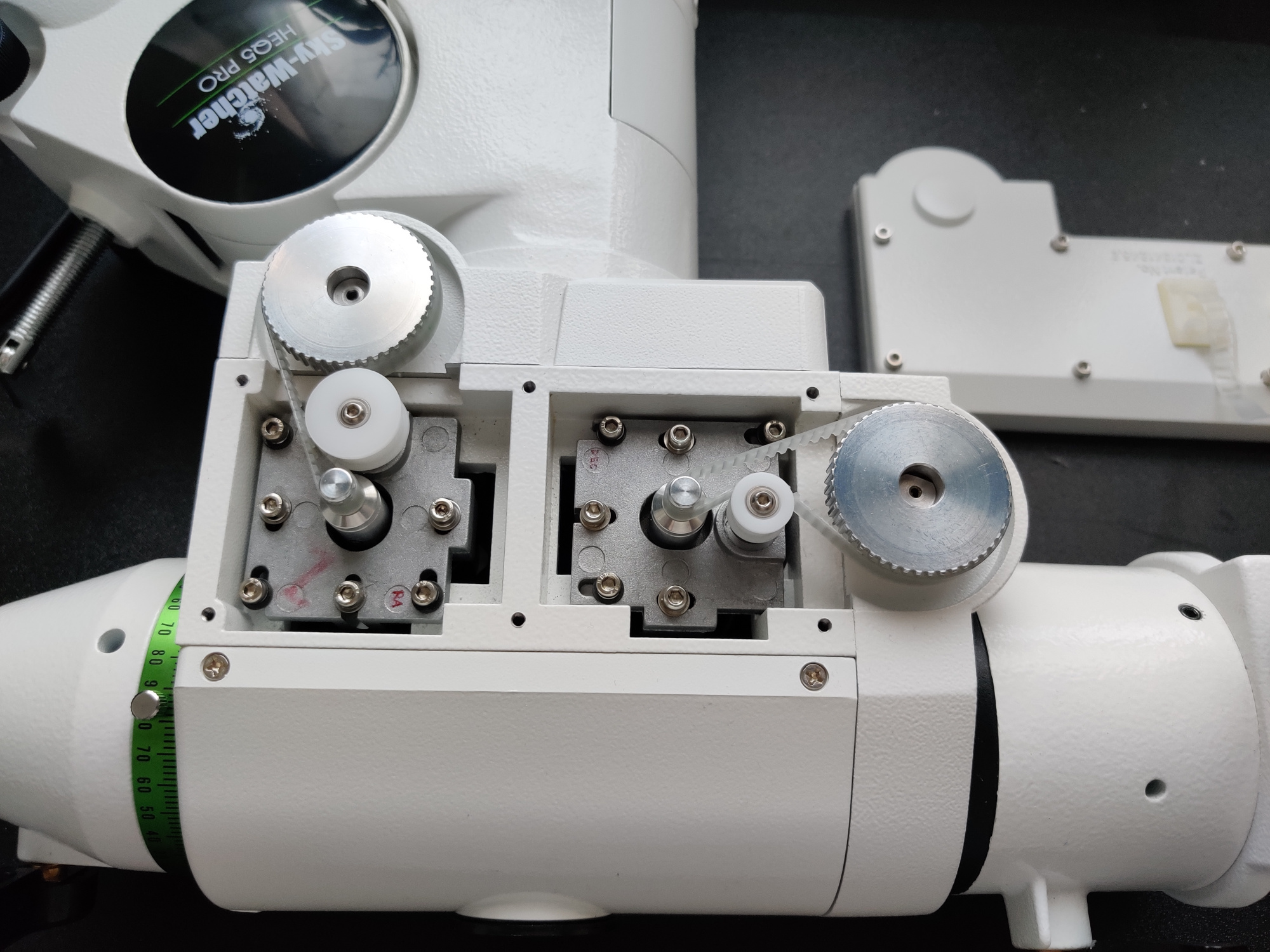 HEQ5 OriginalgetriebeHEQ5 mit Rowan Belt ModDer nächste Umbau war das Getriebe der Montierung. Das originale Getriebe der HEQ5 ist leider sehr stark mit Spiel behaftet. Schuld ist das mittlere der 3 Zahnräder auf beiden Achsen. Es ist nicht kugelgelagert stattdessen wurde eine Gleitlagerung mit reichlich Luft verbaut. Wenn dann noch das Flankenspiel dazu kommt, wird es echt grausam. Der Zahnriemenumbau ist da ein logischer Schritt den jeder HEQ5-User gehen sollte wenn man den Backlash nicht akzeptieren will. Ein angenehmer Nebeneffekt ist auch das deutlich angenehmere Geräusch beim GoTo. Kein Rattern der losen Zahnräder mehr. Backlash ist auch nur noch Geschichte wenn man dann noch das Schneckengetriebe optimal justiert.