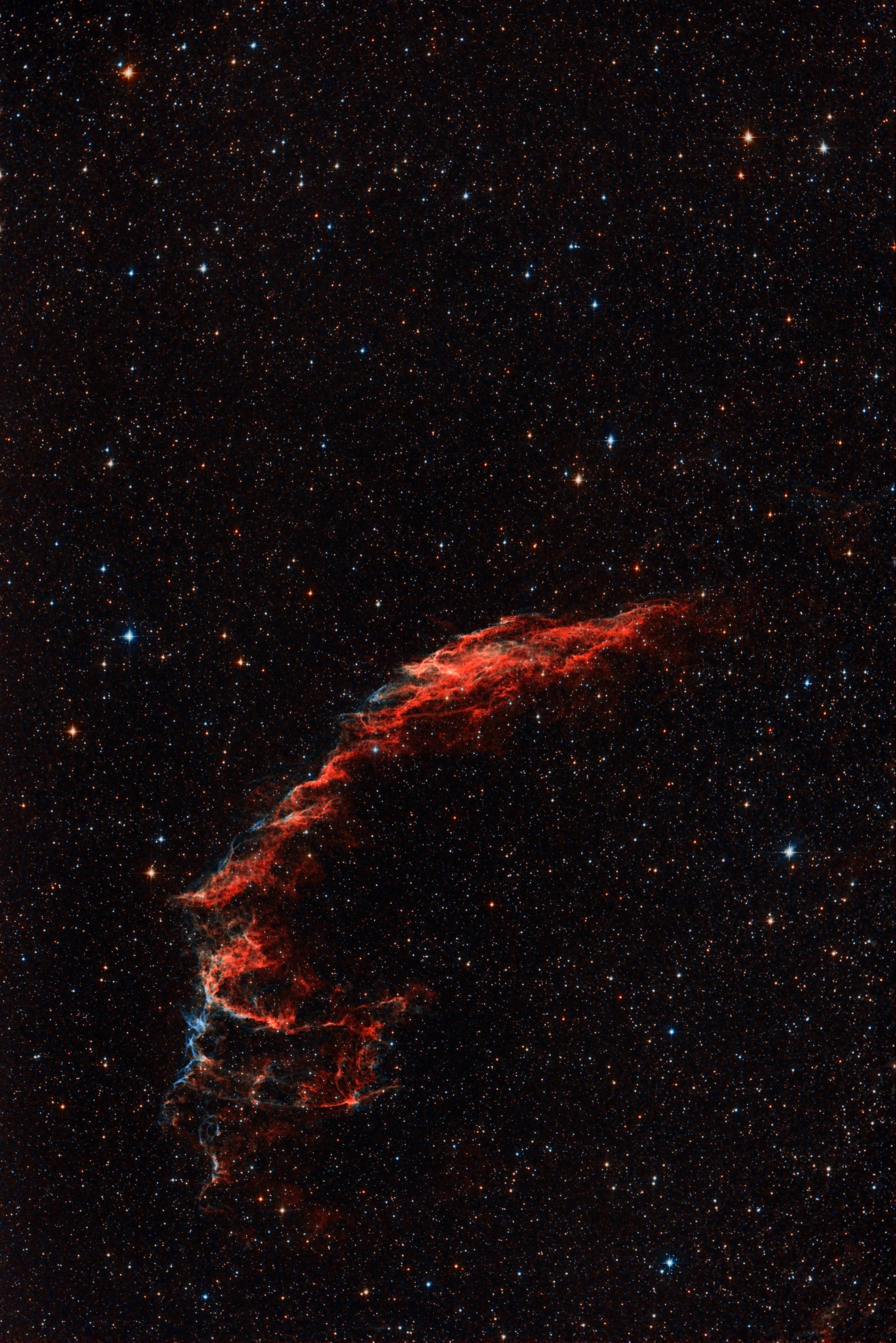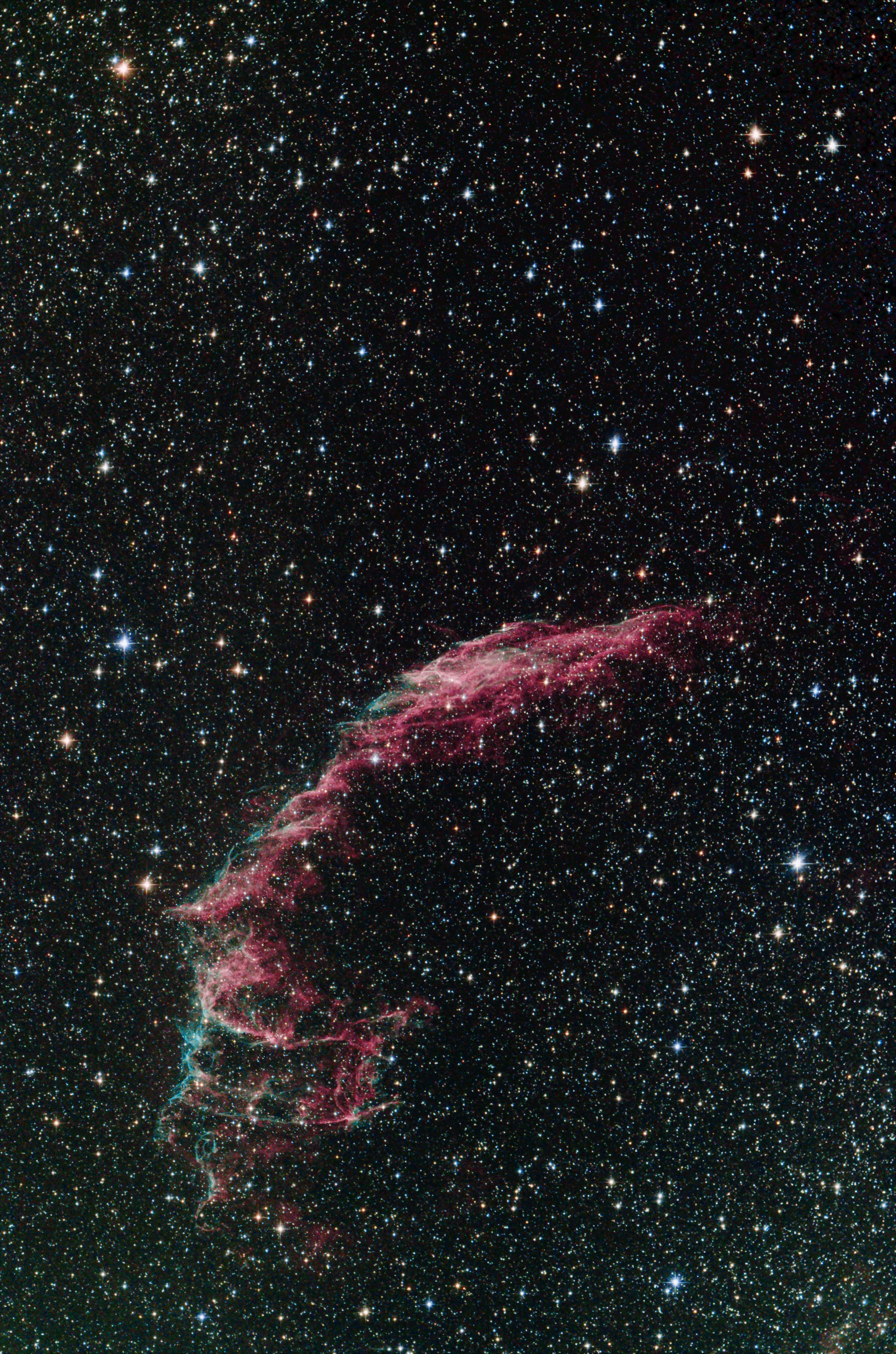 Im Mai 2020, also ca. ein Jahr später, versuchte ich ein Remake der alten NGC6992-Daten mit PixInsight. Damit konnte ich endlich diese heftigen Gradienten entfernen, die Sterne etwas verkleinern und allgemein mit der, in der Zeit dazugewonnenen Erfahrung, eine neue, verbesserte Variante erzeugen. Hier zerlegte ich das Bild mit Starnet++ in PixInsight in ein Bild ohne Sterne und ein Bild nur mit Sternen (Starmask). So konnte ich die Nebelstrukturen etwas mehr hervorheben und die Sterne etwas verkleinern damit im fertigem Bild das Sternenmeer nicht so dominant ist. Zum Schluss wurden die beiden Bilder wieder in ein Bild vereint. Mir gefällt die neue Version besser, was meinst Du? Schreib mir einen Kommentar :) |