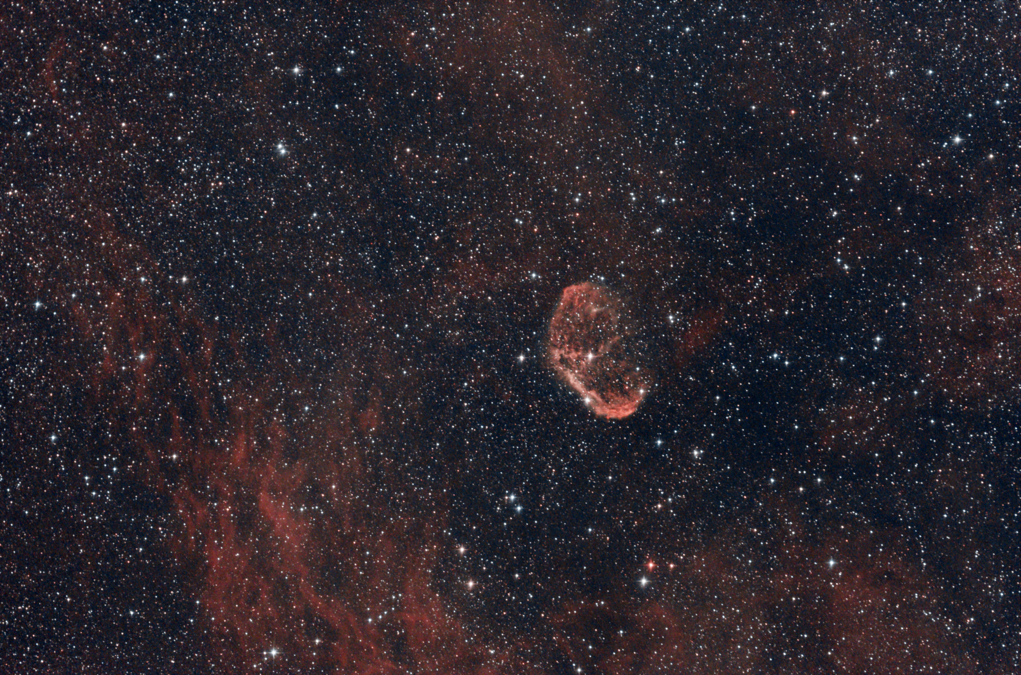 NGC6888 - Erste NachtDie erste Nacht war leider nicht sehr ergiebig aber ich konnte den neuen Dualband Schmallbandfilter testen. Die Einzelframes waren sehr dunkel, nur wenig war zu sehen. Die erste Enttäuschung verflog aber als ich den Stack sah nach einem Autostretch in SIRIL. Da war doch tatsächlich eine ganze Menge zu sehen. Viel mehr als gedacht! Wow!