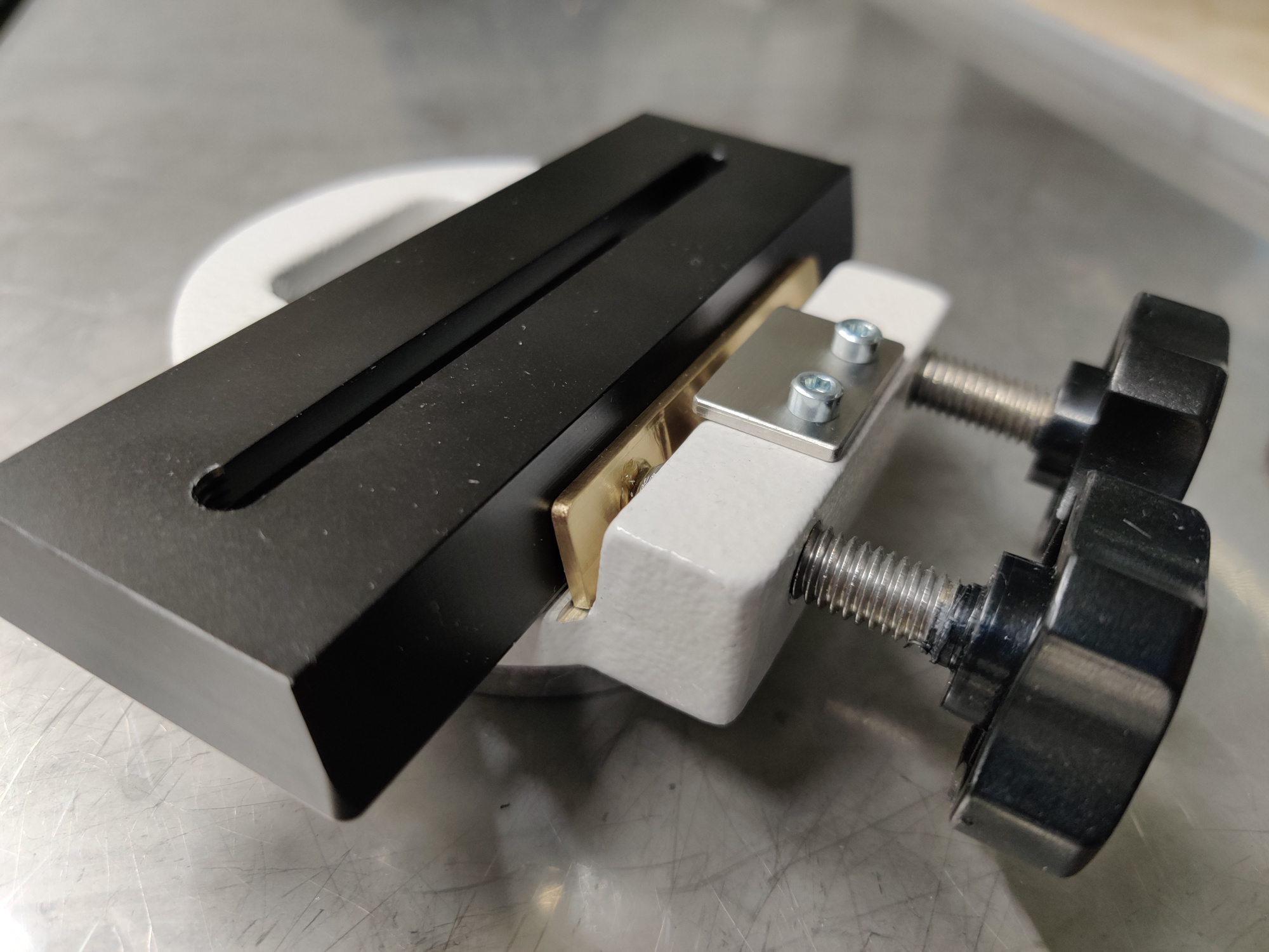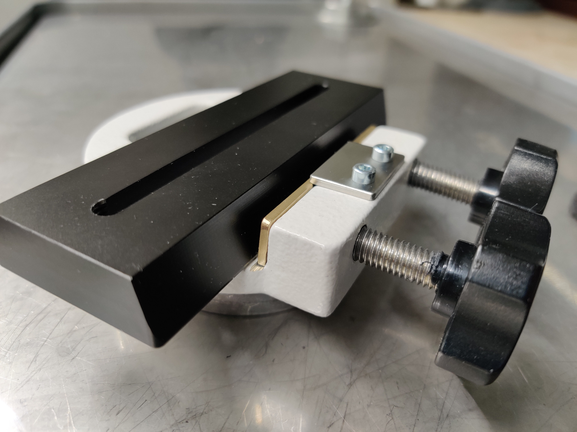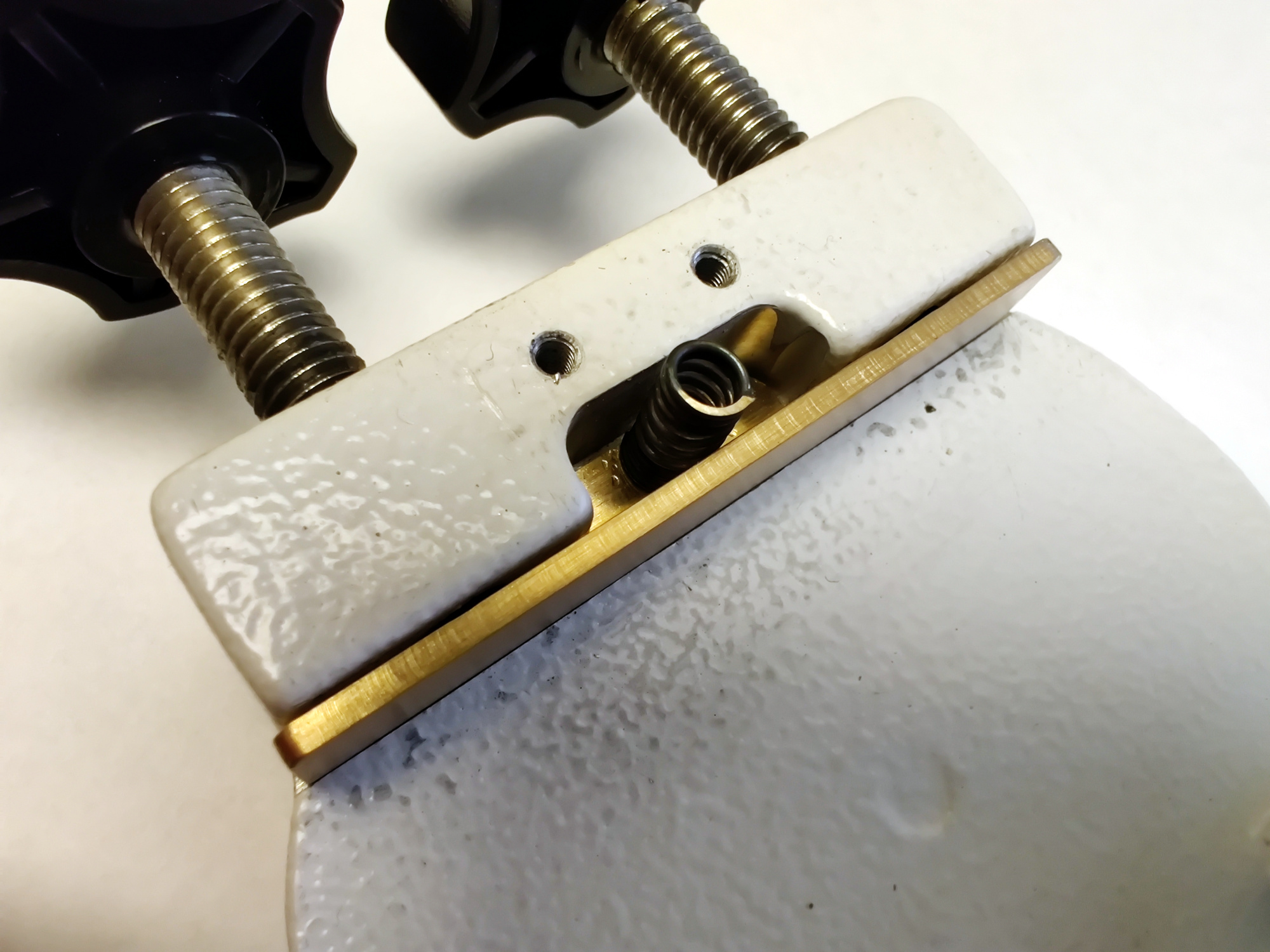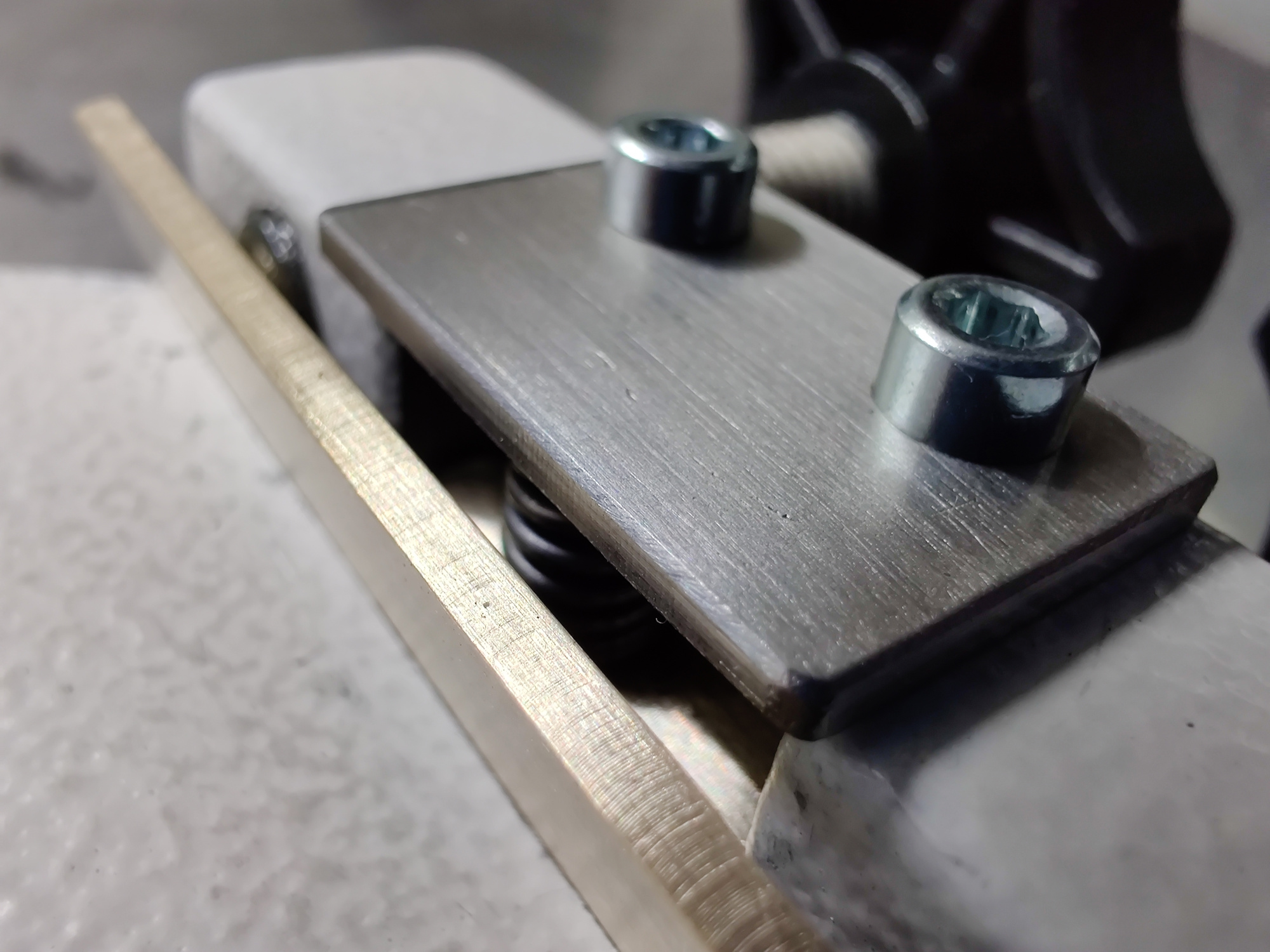 Im geschlossenen Zustand drücken die beiden Rändelschrauben auf den Messing-L-Winkel der dann zum kippen gezwungen wird. Der Messingwinkel ist ja in der Basis etwas eingelassen, so entsteht eine Art Gelenk. Die Feder unter dem Edelstahlblech wird zusammen gedrückt. |